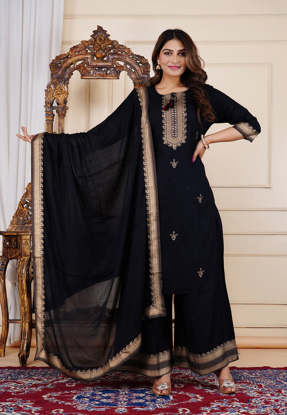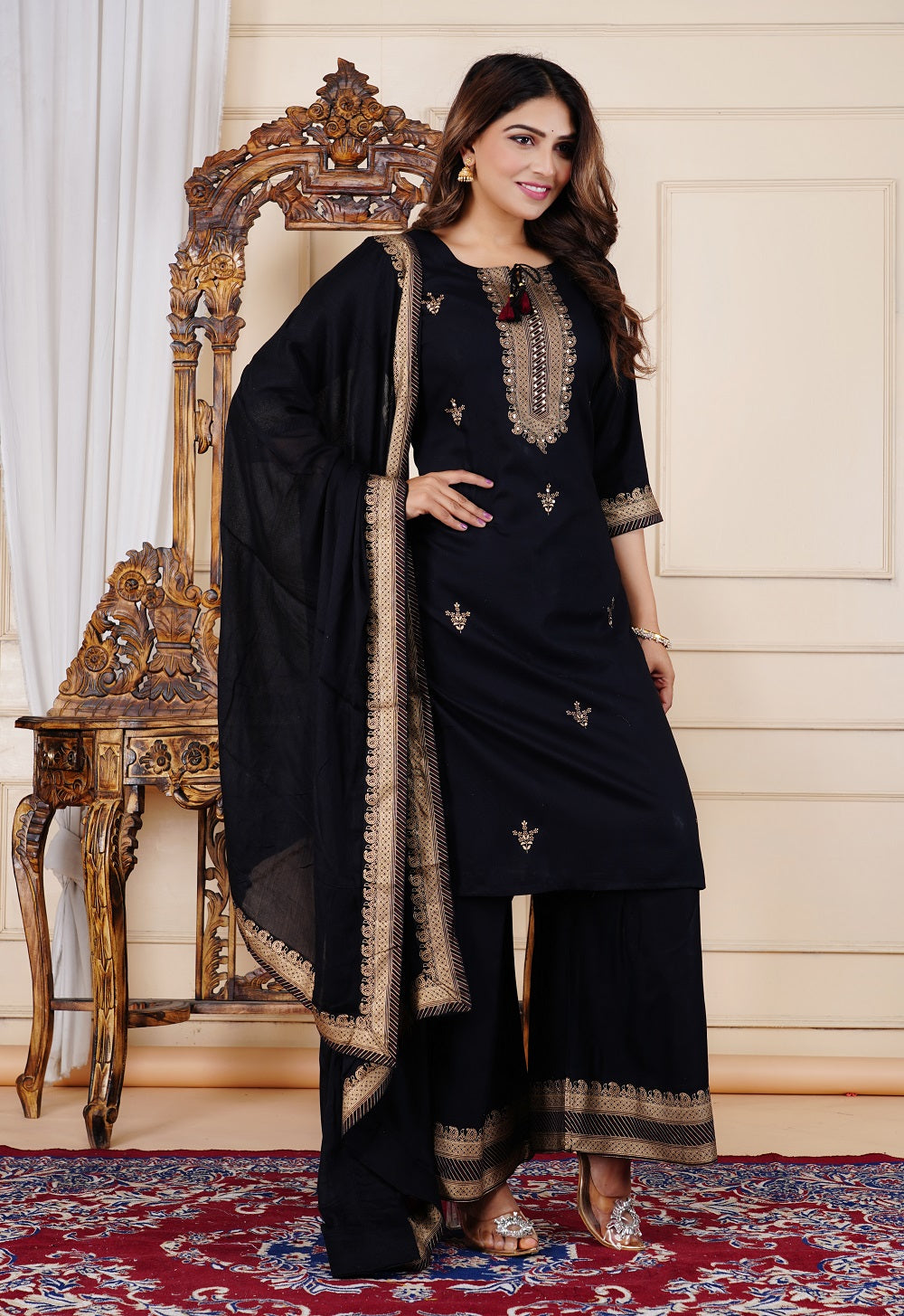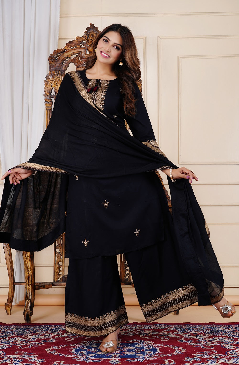 Package Contain: Rayon Embroidery Kurti Palazzo Set with New Broad Border Cotton Dupatta
