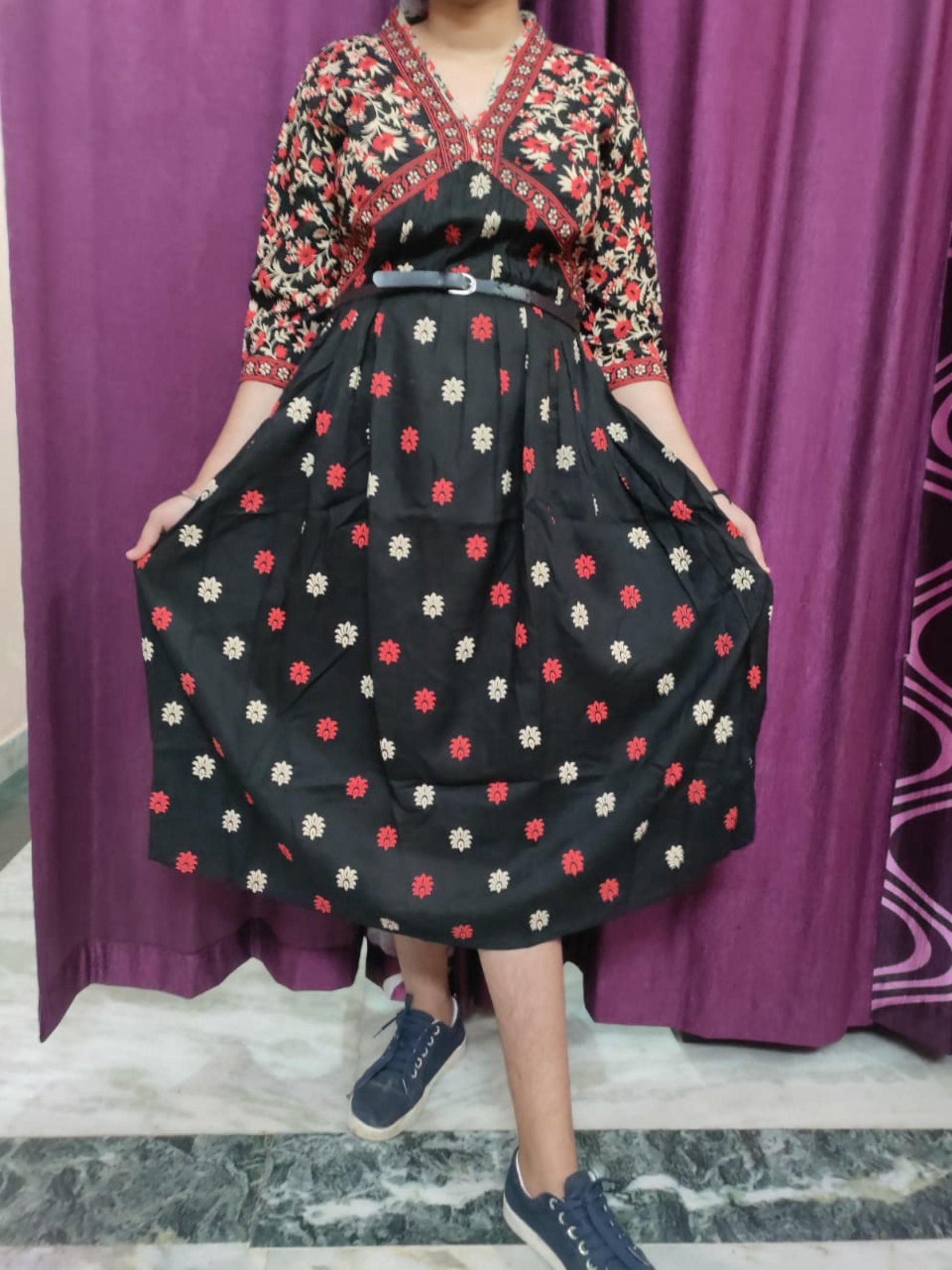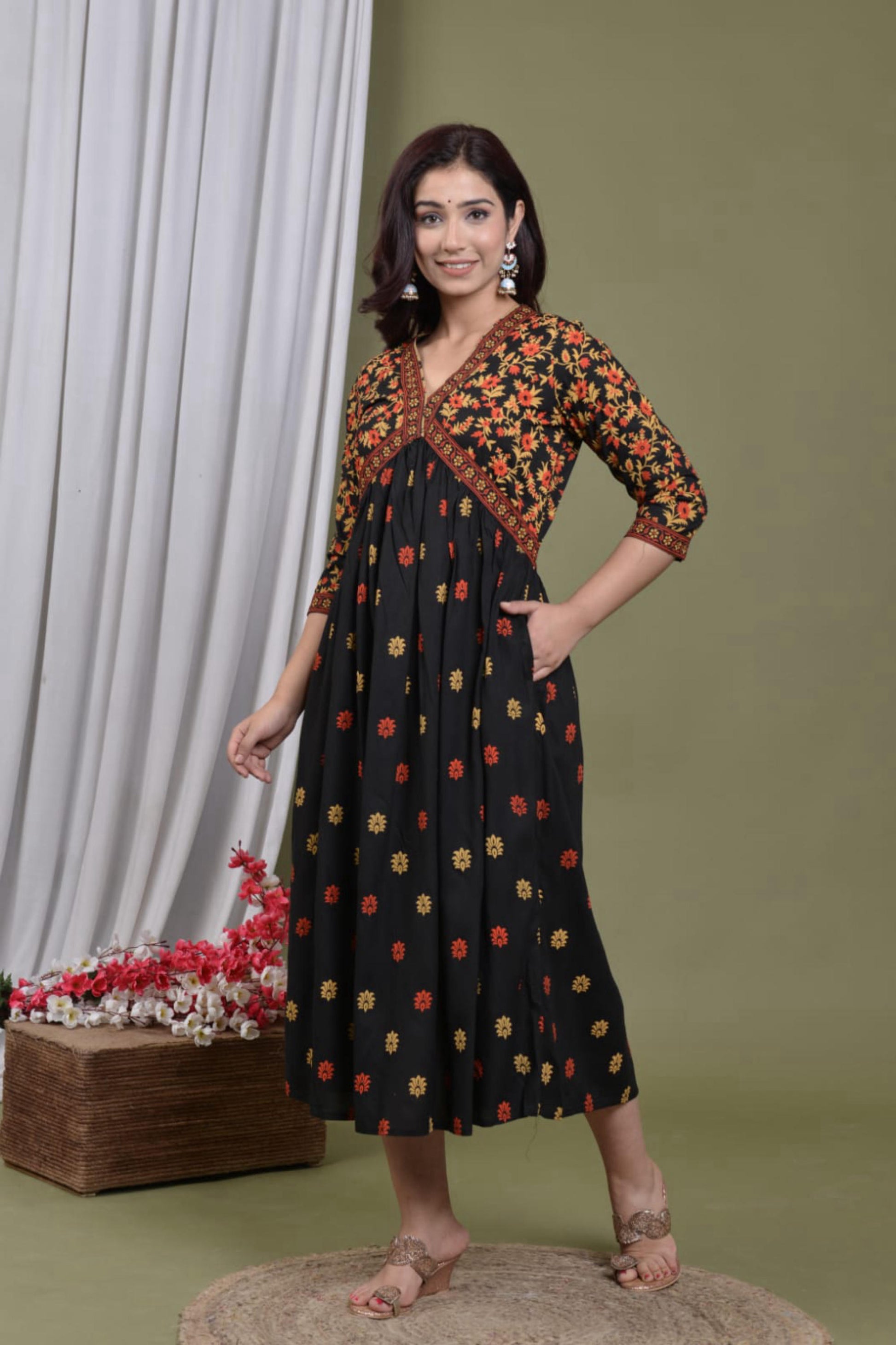 Indian Floral Women Black Kurta, Kurti Flared Tunic Top Wear Dress