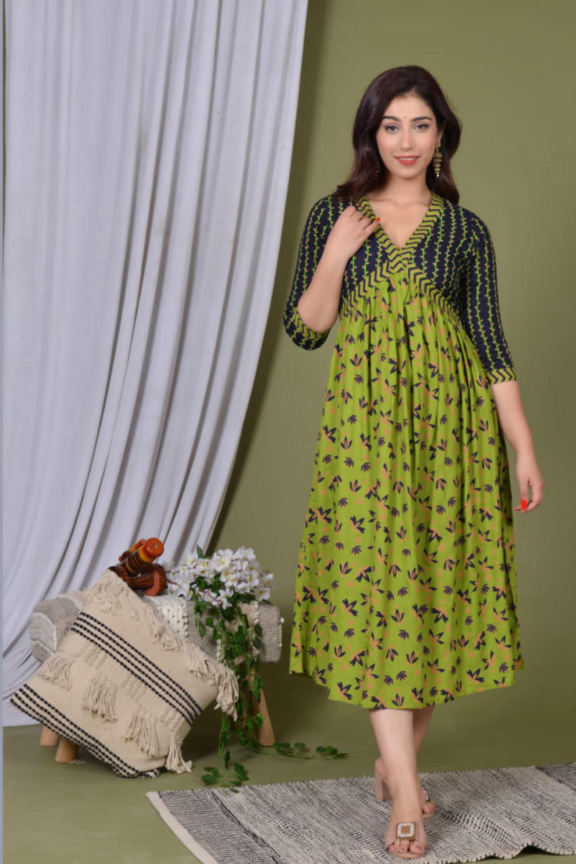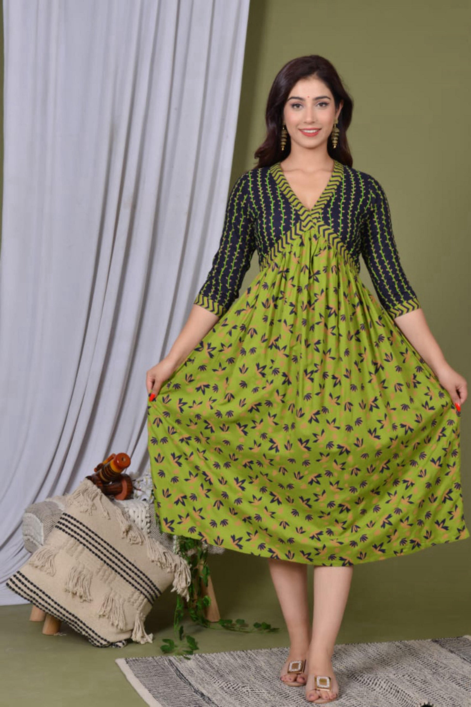 Indian Floral Women Green Kurta, Kurti Flared Tunic Top Wear Dress