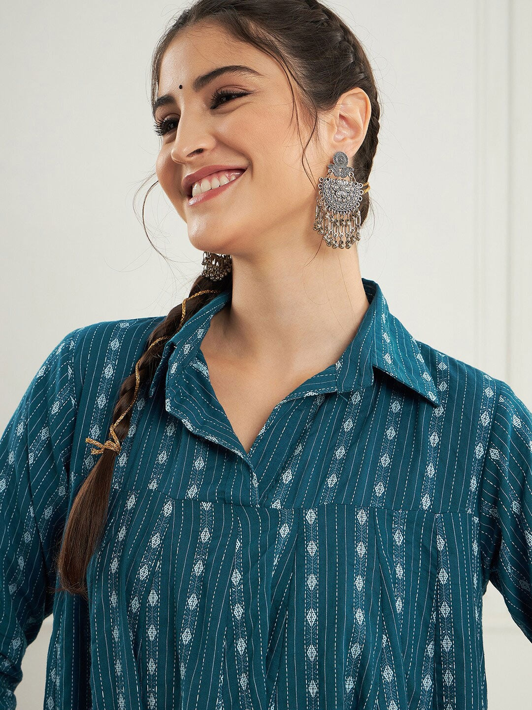 RATAN CRAFTS Beautiful Stylish Cotton Collar neck Knee length Dress in Sea Green color Katha Work Fabric with Mid length Sleeves Gown for women's