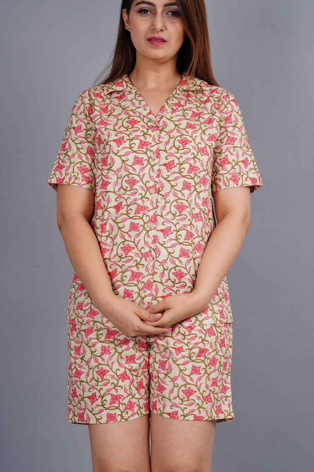 Women Pajama Set Half Sleeve Peach Shirt & Short Pants Night Dress Floral Set. This beautiful Women Pajama Set is handmade in Jaipur, India and is made of 100% pure Indian Rayon Fabric.